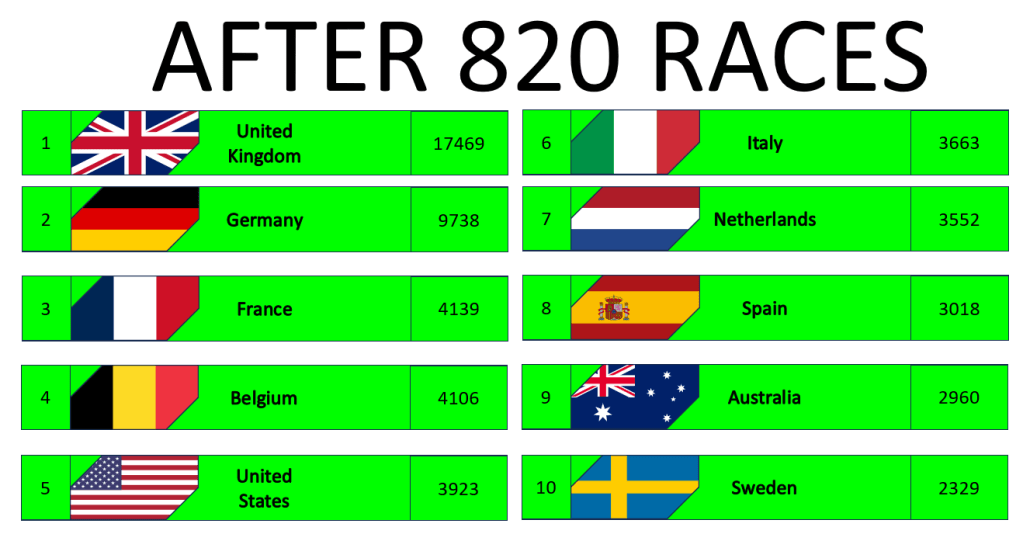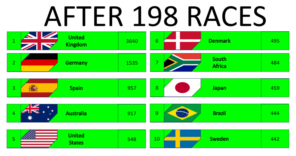 64 seasons of my nations cup have been completed (and over 800 races), so here’s where I discuss what has happened and what’s next, as there’s still so much more to go – nothing’s over yet (except maybe the battle for 1st and 2nd in the cup, as the UK and Germany have that much of a lead over everyone else), as even positions as high as third in the cup have ongoing battles that don’t seem to be going away. So let’s ask ourselves how we got to where we are now and what we still have yet to see!