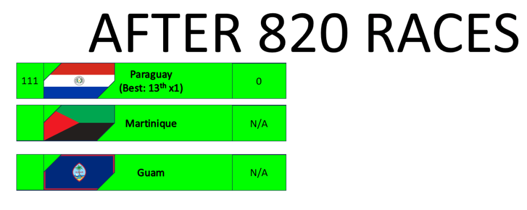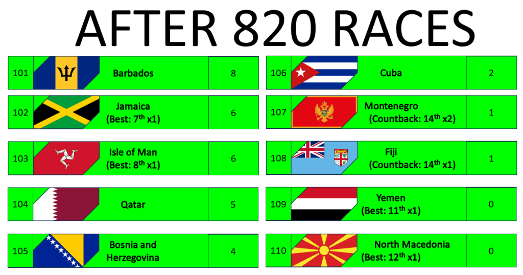 Of course, it’s not only the fact that the majority of these countries have only competed in one or two seasons that have led to them being so lowly-placed, but also that it’s been quite a significant length of time since their seasons were completed, and subsequent seasons have seen fellow lower-placed countries like Bahrain (lowest: 105th) and Romania (lowest: 101st) score significant points hauls that have seen them escape this group. But with a select few of these nations set to return in the near future, there may be all sorts of speculation as to what will happen, and who will escape this group and join the group as replacements. But now, for the answer you’ve been waiting for…